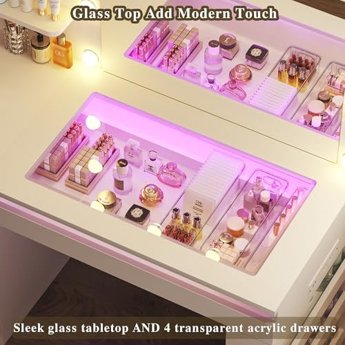 - 【Elegant Glass Top & LED-Accented Acrylic Drawers】A sleek glass tabletop adds a modern touch, while the 4 transparent acrylic drawers softly diffuse built-in ambient LED lighting, creating a luxurious glow and making the vanity desk easy to locate beauty essentials.