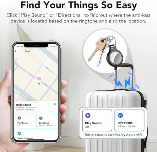 - 【TRACK ANYWHERE】: Tukio's tracker allows you to view your items location in real time. When the distance is less than 200 feet, you can simply tap the "Find My" app, and the key finder locator with sound will emit an 80-100dB beep to help find your things, or just ask Siri for help. When the distance is greater than 200 feet, you can find items further away with the help of hundreds of millions of Apple devices in the "Find My" network.