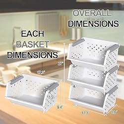 GREAT SIZE: Set of 3, each bin size: 17.3" x 13.5" x 9.4" HEAVY DUTY: Made with tough, long-lasting plastic, these open front storage baskets are designed for frequent use and are resistant to rust, offering reliable clothes, vegetables, hardware, parts, toiletries and shelf storage in the kitchen, bathroom, garage, home, shed, or any environment QUICK AND EASY ACCESS TO CONTENTS: The open front allows you to grab your essentials without removing bins stacked on top, makes your items readily available to see and reach, without having to move the bin around, granting you easy access to whatever you have stored and making it easier than ever to check on the freshness of stored food LARGE HANDLES: The storage bins feature large, easy-to-grip handles, making them simple to move around Stackable: The plastic stack bins can be interlocked vertically to save floor or garage space. When not in use, nest each container together to conserve space and make for convenient storage