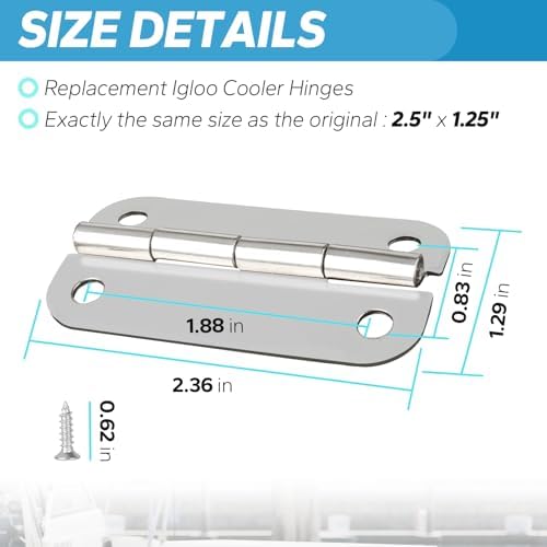 - Igloo Cooler Hinges Replacement: Upgrade your cooler with Igloo's heavy-duty stainless steel hinges. Includes 3 stainless steel hinges and 12 screws for igloo ice chests ,Hinges size : 2.5 inches x 1.25 inches.