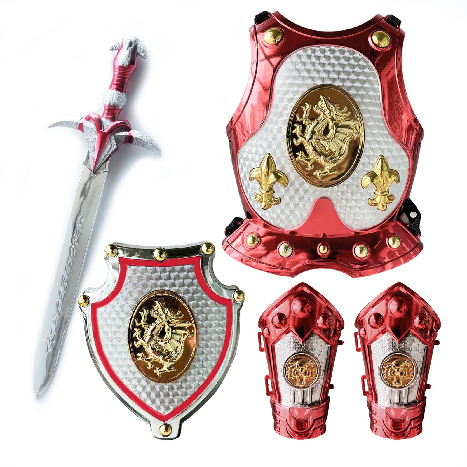 Kids Knight Costume with Armor Set - Medieval Crusader Role Play Costume for Boys 3-5, Plastic Armor Suit with Sword, Shield,Vambrace,Royal King's Crown,Dragon Design Dress Up Cosplay