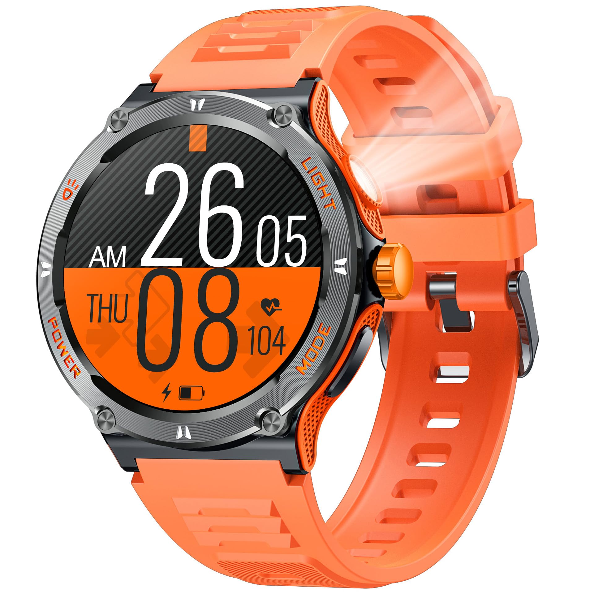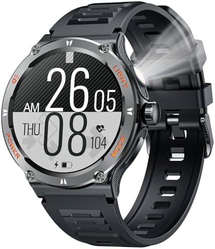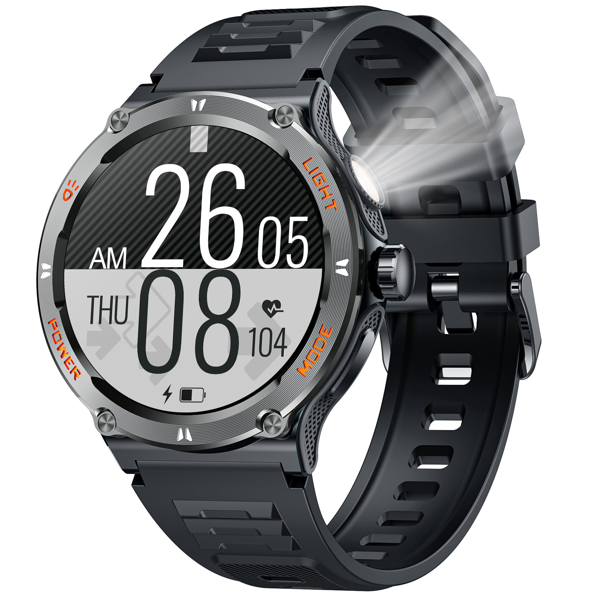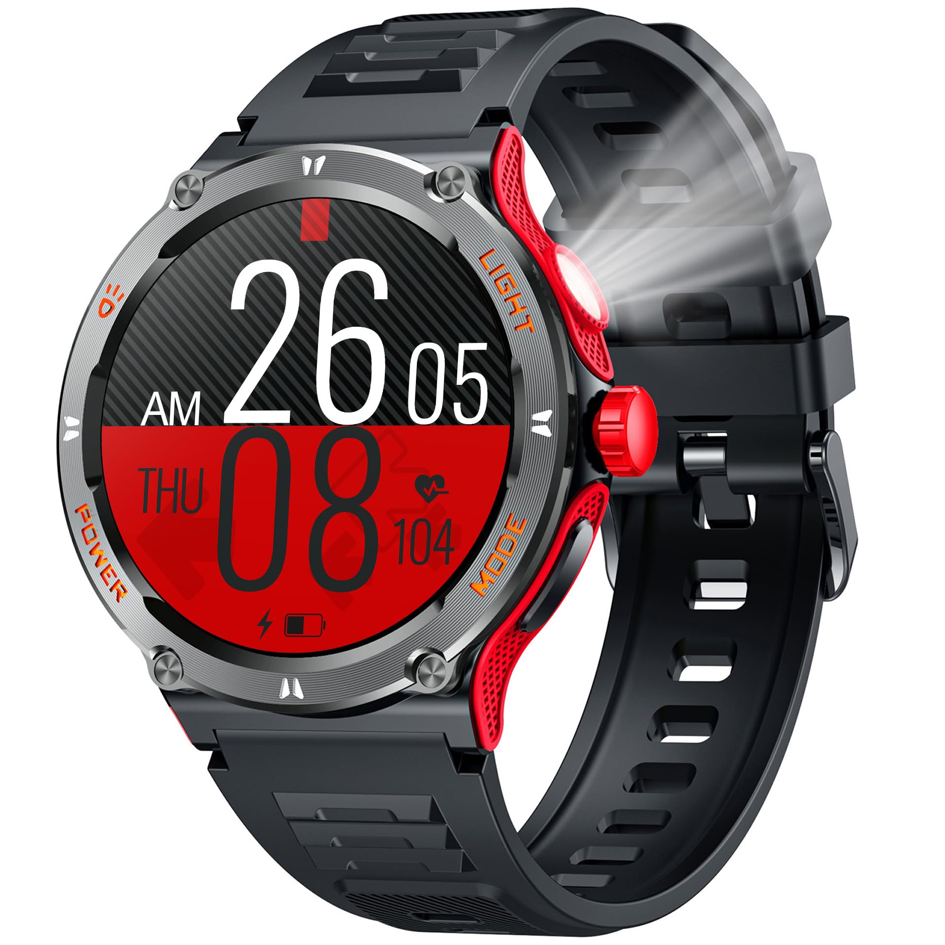 - Smart watch for men Outdoor and Travel: Military SmartWatch men equipped with a strong flashlight on the side, with lighting distance of up to 6-8m, Whether you're hiking, camping, or exploring at night, it can provide the necessary lighting. smartwatch flashlight has three lighting modes: strobe mode, signal mode, and lighting mode. The tactical Smart Watch for men also comes with a compass for exploring and outdoor activities, no longer to fear emergency situations in the dark or getting lost