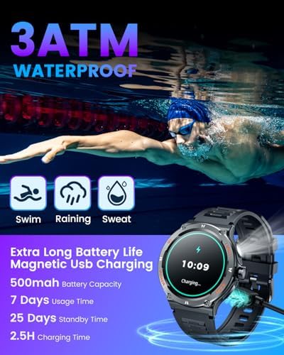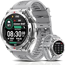 - Multifunctional Smart Watch for Men: Military Smartwatch equipped with a 1.53-inch HD large screen, compatible with most Android and iOS phone (iOS 8.0 above and Android 4.4 or later above). Rugged and durable Smartwatch has a 500mAh battery, 3ATM waterproof design, calculator function, weather forecast, music player, alarm clock, wrist lift to light up the screen, call alert, SMS alert, alarm reminder, take photo control on watch, phone search, flashlight for lighting or sos, compass and more.