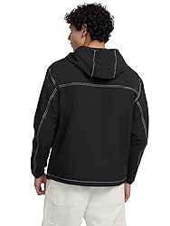 Multiple zip pockets Front logo Front zip closure Packable hooded windbreaker jacket