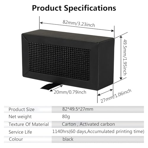 - Easy Installation: The activated Carbon air filter is easy to install, can be easily assembled. The service life can reach up to 1,140 hours (cumulative printing time).