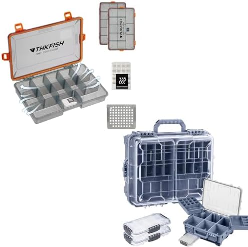 - LARGE CAPACITY TACKLE BOX: Size: 13 "L x 10 "W x 4.8 "H. THKFISH waterproof tackle box can hold almost all fishing tools. The upper compartment is shallow and suitable for storing lures, hooks, floats, etc. The lower level is deeper and suitable for storing fishing reels, pliers, line and other slightly larger fishing tools. The bottom can store two 3500 fishing tackle boxes (included), which is great for managing your fishing gear!