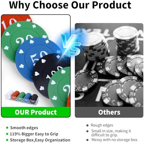 - Thickened Poker Chips Set: Includes 100 Thickened ABS chips (20 each in 5 vibrant colors: White/Red/Green/Blue/Black) + durable Acrylic box. Portable & instantly organized for home, nights, or classroom.