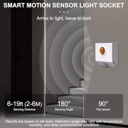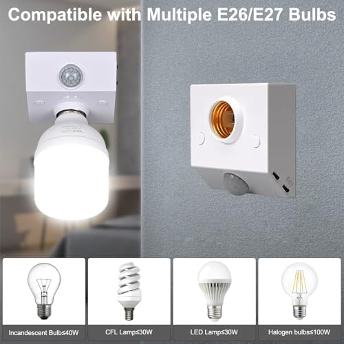 - Automatic Motion Detection: The smart motion sensor light socket automatically turns the light on when motion is detected and off after a delay, providing energy-efficient, hands-free lighting. Perfect for stairways, hallways, garages, courtyards, and warehouses. This auto dusk to dawn socket is a great solution for automated lighting