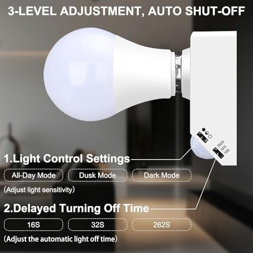 - Customizable Delay Settings: Adjust the light-off delay according to your needs. Options include 16 seconds (quick pass), 36 seconds (daily use), and 262 seconds (for areas requiring continuous lighting). The motion sensor light socket gives you flexibility for various environments