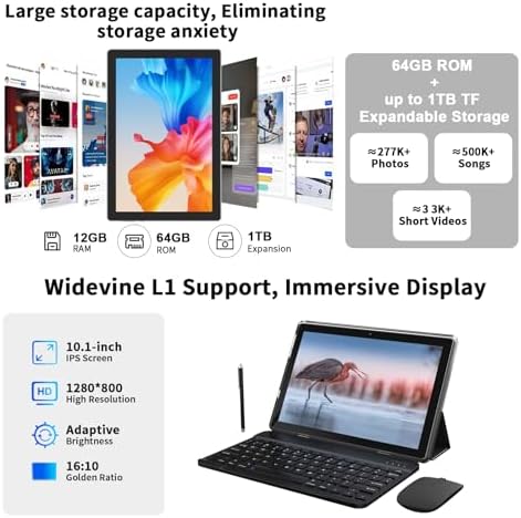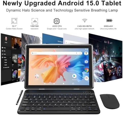 - 【Portable 2 in 1 Tablet with Keyboard】 This 10.1 inch android tablet equipped with a bluetooth keyboard, wireless mouse, and stylus as well as a foldable protective case, allowing you to seamlessly transform your 10'' tablet into a laptop-style device. This versatility makes it the ideal device for those who need to be productive on the go, whether it be for work, study, or play.