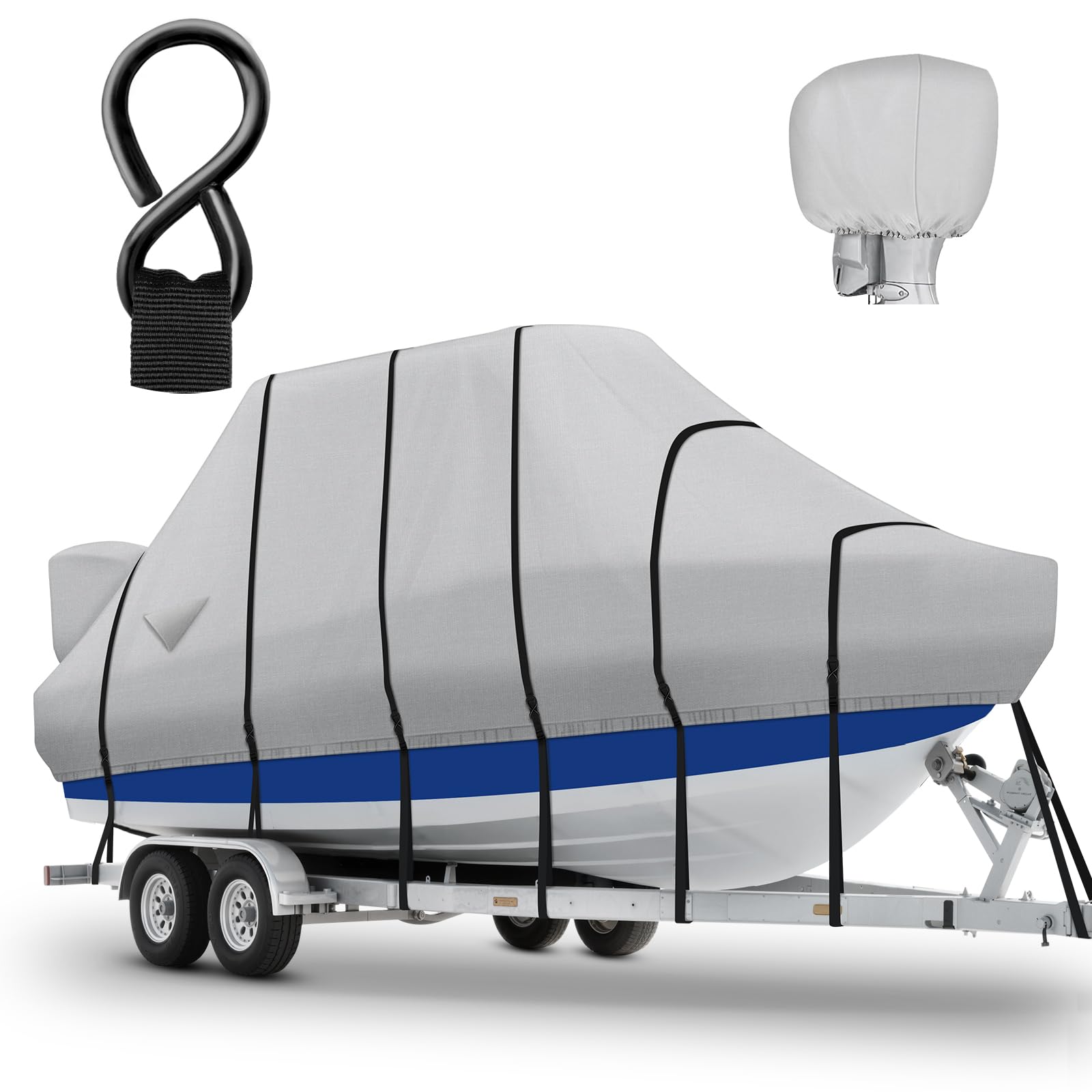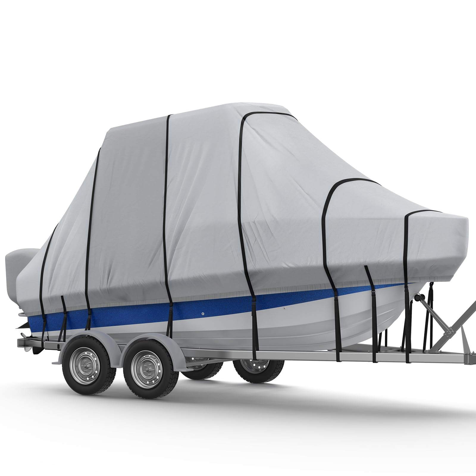 1200D Wake Tower Boat Cover,Heavy Duty Waterproof Wakeboard Boat Cover with Adjustable Metal Buckle,Fits 25ft - 27ft V-Hull Boats with Ski/Wakeboard Tower,Light Gray