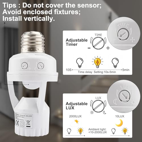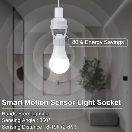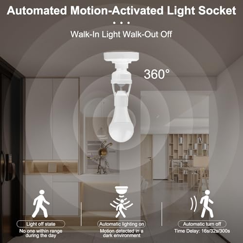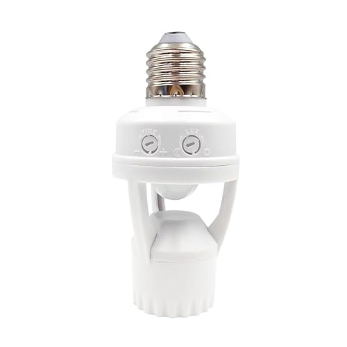 - AuEnergy-Saving and Convenient: This screw in motion sensor light socket turns on when motion is detected and automatically turns off when no movement is detected, preventing energy waste caused by forgetting to turn off the light. It is ideal for areas like hallways, garages, and stairways that are infrequently used but still require lighting. It automatically lights up when you return home or when carrying items, freeing up your hands. Perfect for entrances, courtyards, and warehouses where automatic lighting is neededtomatically powers lights at dark and shuts off at daw