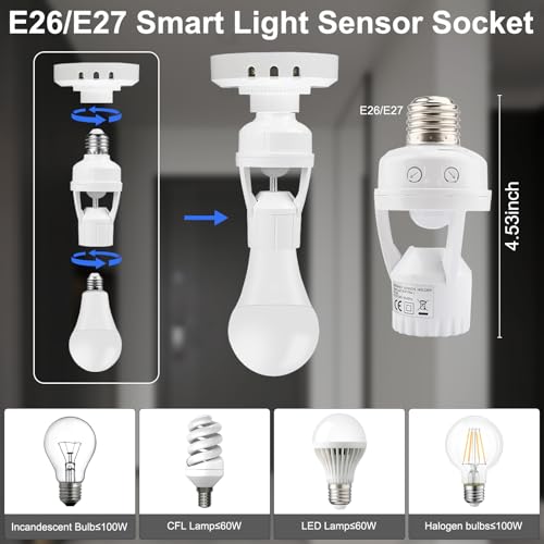 Motion Sensor Light Socket, Auto On/Off E26/E27 Light Sockets Motion Sensor Adapter, Screw in Bulb into Smart Light Socket for Automatic Dusk-to-Dawn Activated Lighting, for Basement Porch Garage