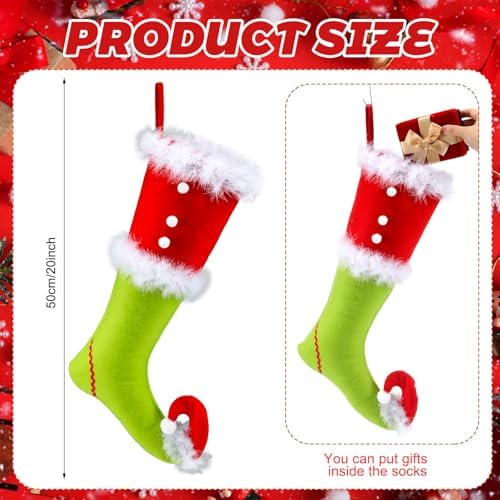 Features: Their bright colors and eye catching designs can instantly brighten up any space and create a festive atmosphere for your holiday parties and gatherings. Hurry up and get ready for the upcoming Christmas to add a Christmas atmosphere to your home Specifications: Material: Color: red, green Size: 19.7" christmas stockings Package includes: 2 Pack 19.7" christmas stockings Notes: Manual measurement, please allow slight errors on size. The color may exist a slight difference due to different screen displays