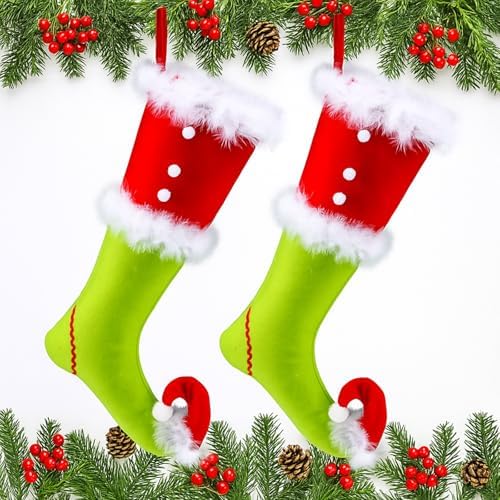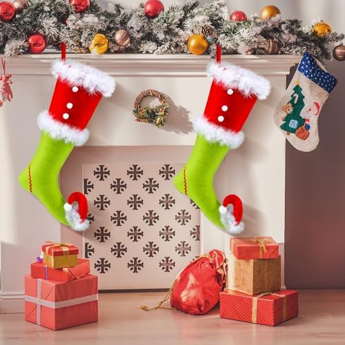 Cozypower 2 Pack 19.7" Christmas Stockings Ornament, Green Color Faux Fur Elf Stocking Decoration Ornaments for Holiday Fireplace Home Indoors Red and Green