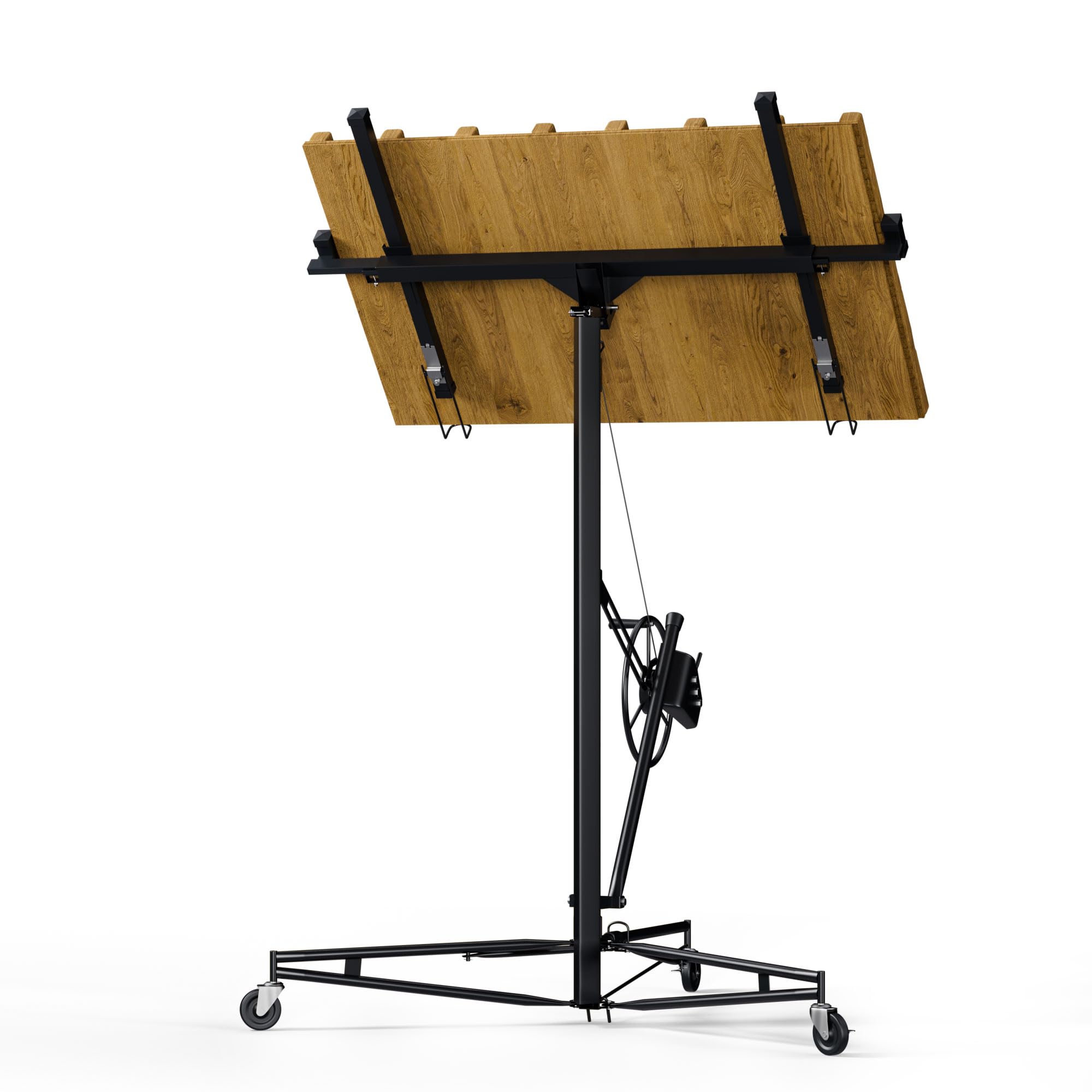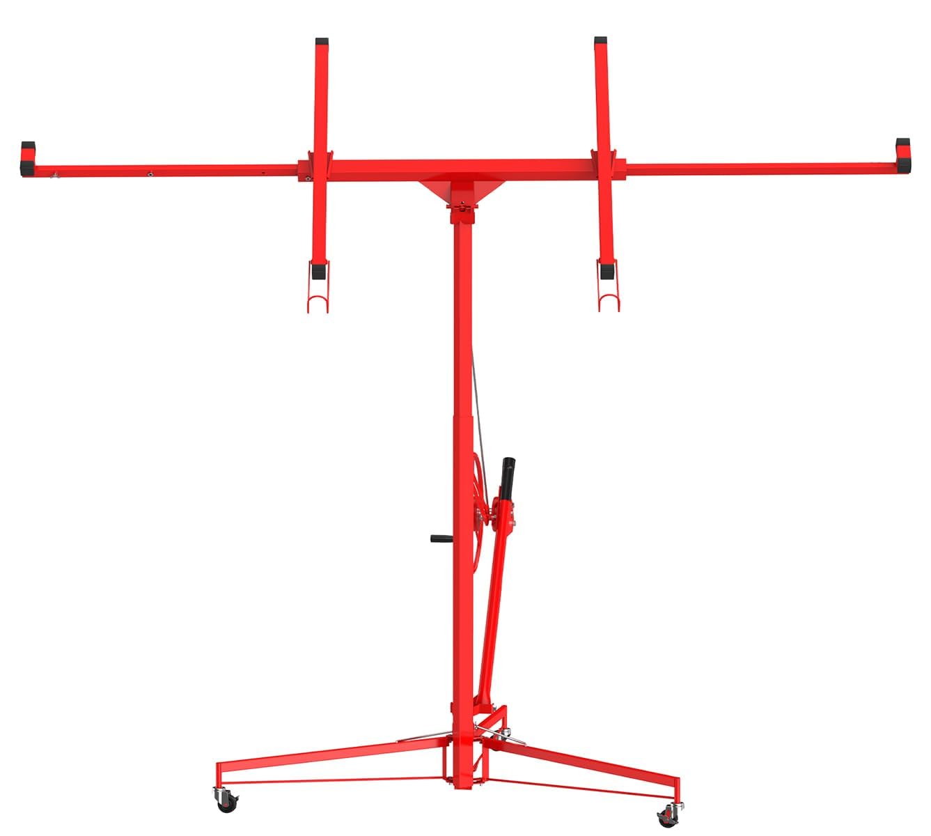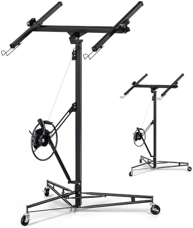 - 150 LBS Capacity Drywall Hoist:This drywall lift is constructed from durable steel,Can load 150 capacity drywall hoist. It features a built-in winch and braking system that ensures smooth and controlled lifting of drywall panels. The triangular base structure enhances stability, preventing wobbling or tilting during operation.