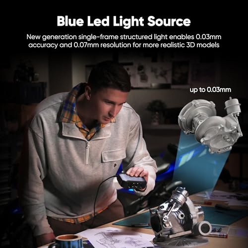 - Blue Led Light Source: 3DMakerpro Moose 3D Scanner adopts next-gen single-frame structured light technology with a blue LED source, enabling up to 0.03mm accuracy and 0.07mm resolution. Capture highly detailed, realistic 3D models with ease.