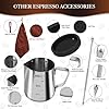 - Espresso Machine Accessories:The stainless steel milk frother is marked with scales on the inside and outside for easy and accurate measurements, it is dishwasher safe. Silicone tamper mat protect the tabletop and portafilter from damage, preventing the portafilter from slipping off when punched. Professional latte art pens and decorative stencils can draw beautiful coffee patterns. The exquisite coffee stirring spoon is the perfect coffee companion