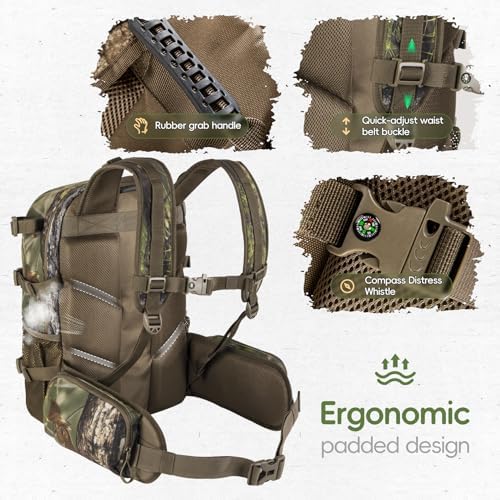 - Lightweight&Comfortable:Padded shoulder straps and a ventilated mesh back panel effectively reduce fatigue, while the adjustable chest strap/waist belt evenly distributes weight. The height-adjustable chest strap makes it an ideal choice for long treks, camping, or big-game hunting