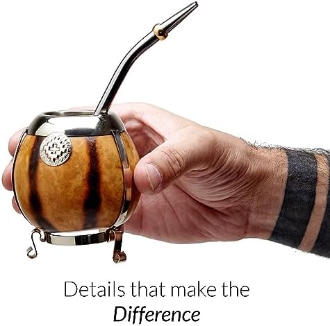 - NATURALLY AUTHENTIC - Authentic handcrafted in Argentina natural Gourd. No machines, a unique style and artwork making each piece unique. Each Calabash Gourd grows uniquely, at his time and form. No two are the same. Some are bigger, some are smaller. Nature does not repeat - it creates. Years pass by and every sip brings sweet memories and special feelings with a unique taste that only a natural Gourd can provide. Contains approximately 7 oz I 200 ml. The Bombilla Is 5.5 inch I 14 cm long.