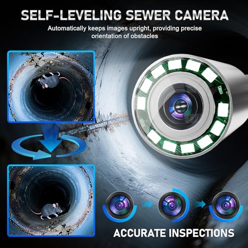 - Self-Leveling Sewer Camera for Accurate Inspections: The 0.9" self-leveling drain camera automatically keeps images upright, providing precise orientation of obstacles for faster diagnostics. Its IP68 waterproof sapphire lens and 12 adjustable LED lights with stepless brightness deliver bright, clear viewing in dark or wet environments, while the 140° wide-angle probe and 5x digital zoom capture every detail. Ideal for inspecting sewer line, drain, pool, HVAC duct, and other hard-to-reach areas