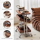 Versatile 3-Tier Design with Adjustable Storage : This 3-tier rolling side table cart features two adjustable shelves, allowing you to customize storage to fit your needs. Its adaptable design allows it to effortlessly transition between a coffee table, storage cart, or even a bar cart, making it ideal for living space 100% Rubber Wood & Stainless Steel Construction: Crafted with Rubber Wood and durable stainless steel, side table on wheels combines the timeless appeal of natural wood with the sleek, modern touch of stainless steel. The sturdy wood surface offers a rich texture, while the stainless steel frame ensures lasting strength Multi-Functional Storage for Every Room: This versatile cart can be used as a side table, bedside table, or mobile bar cart. Its spacious shelves and sleek design provide storage flexibility, making it perfect for living rooms, bedrooms, or home offices Effortless Mobility with 2 Locking Wheels: Designed for easy movement, this end table cart features smooth-rolling wheels that make repositioning a breeze. Two wheels lock in place for added stability and safety, allowing you to move it freely and securely when needed Compact Narrow Design for Small Spaces: With a narrow, compact design, this small bar serving cart fits nicely into smaller spaces like apartments or bedrooms. It provides functional storage without compromising on style, blending seamlessly with modern interiors