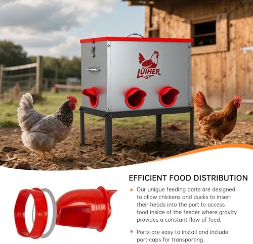 LUIHER Poultry Feeder-25LB no Waste chincken Feeder 6 Ports Large Capacity Galvanized Metal Poultry Feeder with Legs and Lids - Reduces Refilling Frequency Chicken Feeding Equipment for Hen Coop