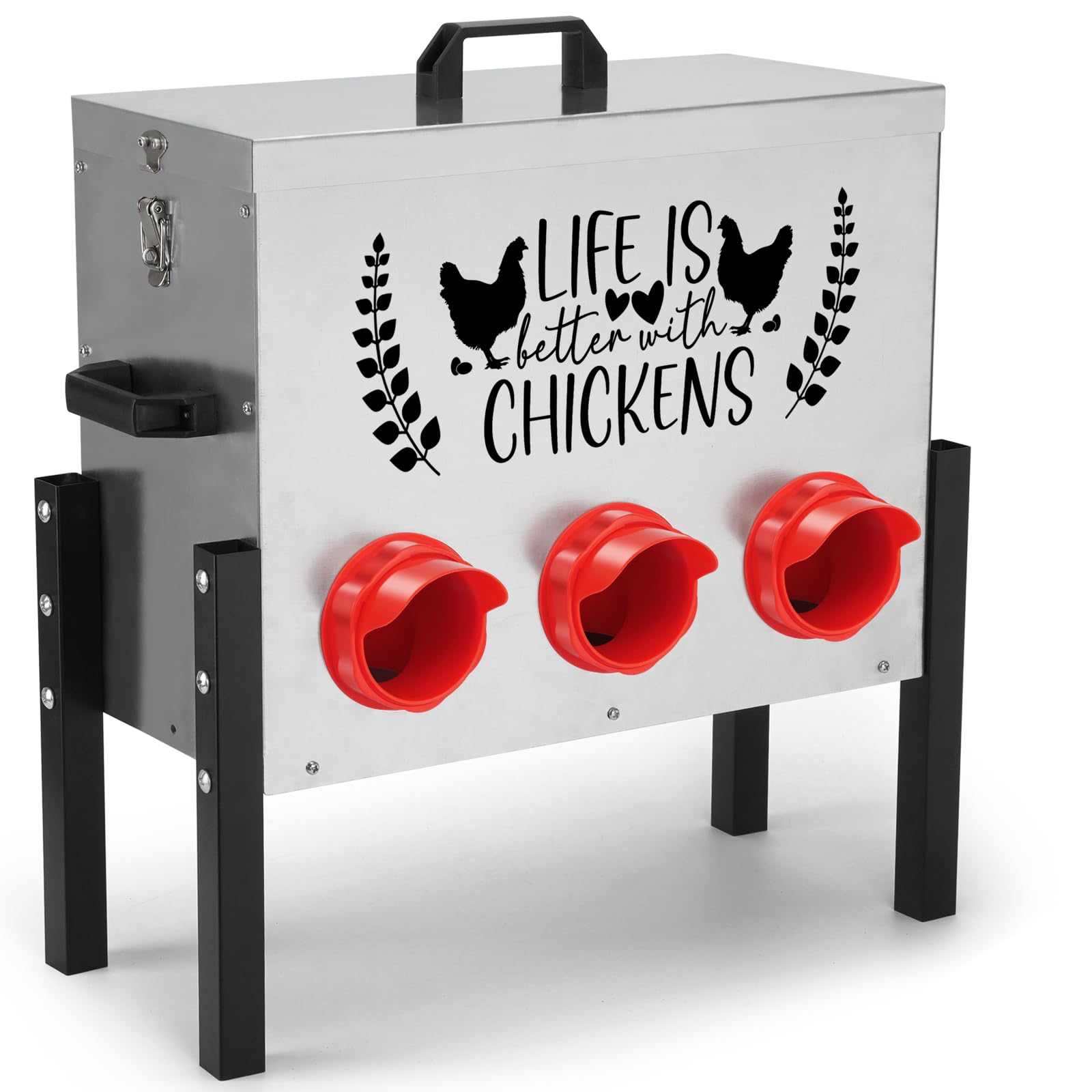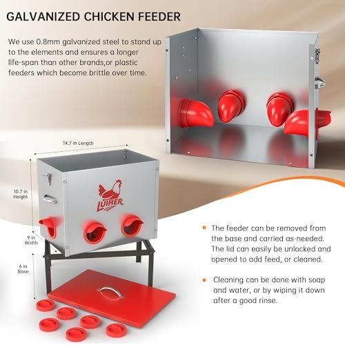 - [PRACTICAL DESIGN] This chicken feeder includes a cover and latch to prevent other animals from accessing the feed. The top and side handles are designed for easy opening and lifting. keeping the feeder clean and saving on feeding costs.