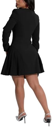 acelyn Womens Sexy Square V Neck Short Wedding Dresses Long Sleeve Button A-Line Pleated Blazer Club Party Mini Dress Black