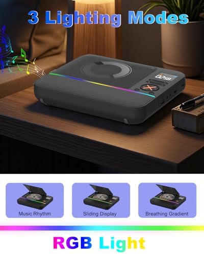 - 【Desk CD Player with RGB Light】The back of the CD player is designed with a hidden stand. With the bracket in place, the CD player can be stably placed on a bookshelf, table or cabinet very conveniently and save more space. desk CD player with RGB lighting with 3 color changing modes (Music Rhythm, Sliding display, Breathing gradient) to give you a magical visual and auditory effect