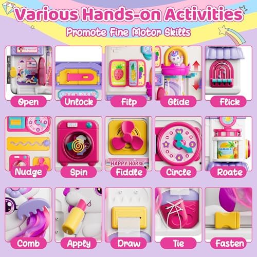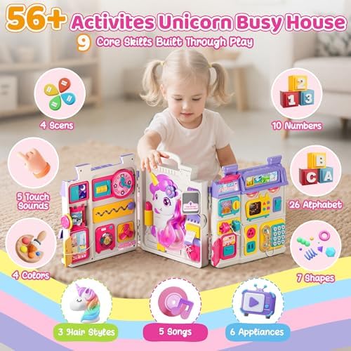 - Touch & Talking Unicorn Busy House with Real Hair - Sensory Toys for Toddlers 1-3: Our unicorn is your child's interactive pet with 5 sensory touch points (head, eyes, nose, hands, feet) and real comable hair. This isn't just play; it's a crucial practical life skill activity that teaches grooming, tying shoes, wearing seatbelts, patience, and creativity—a beloved feature you won't find on any other busy board.