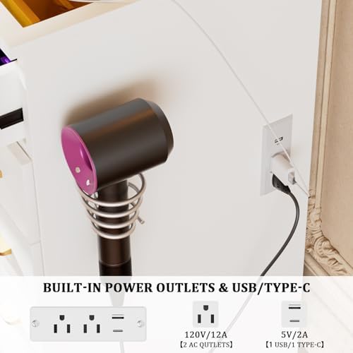 - CHARGING VANITY TABLE: This vanity table adds an upgraded design with 2 AC outlets, a USB port and a Type-C interface, allowing you to sit at your vanity and use your hair dryer or curling iron with the power strip within easy reach. It also provides great convenience for charging mobile phones, tablets, headphones or other mobile devices