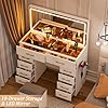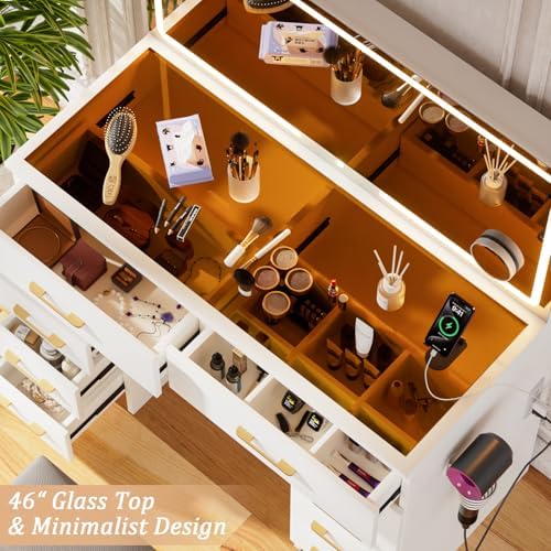 - LUXURY GLASS TOP VANITY: The design of glass visible tabletop allows you to see every cosmetic/jewelry under the desktop at a glance and easily find the cosmetics/jewelry you need. Customizable Knobs and Elegant Design: Personalize your vanity desk with drawers with the included custom knobs, adding a touch of elegance to this sleek and functional cute vanity