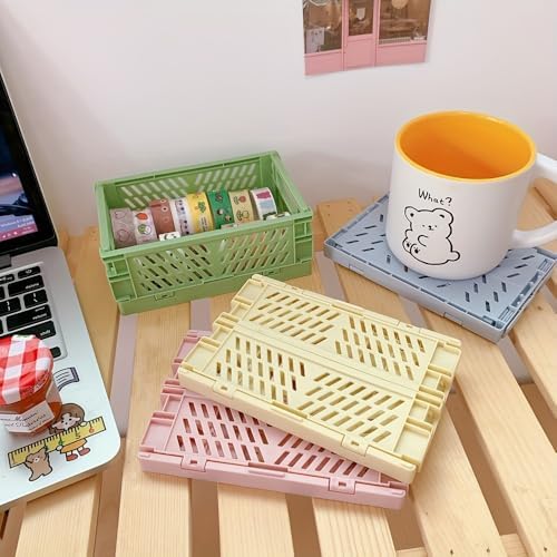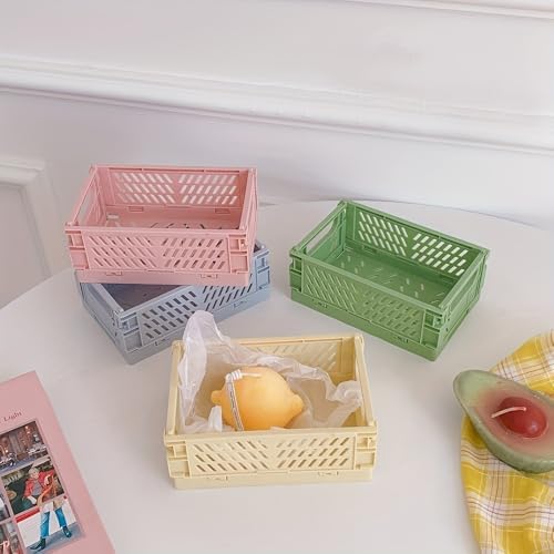 4 PCS Mini Foldable Storage Bin for Desk Organization, Stackable Small Plastic Storage Crates for Home Office Organizer, Folding Small Storage Basket Container