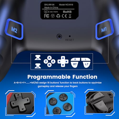 - 【2 BACK PROGRAMMABLE BUTTONS】Switch pro controller with 2 back programming buttons, there are two modes, which are single programming or multi-programming. M1/M2= A+B+Y+L+ZL+R+ZR+D-pad, then you can use other fingers to operate more comfortably and centered. Switch controllers with the programmable buttons helping to minimize button abuse and stick clicking it can last more than several years with heavy use.(Programming should be done on the ELISWEEN controller, not directly on the Switch 2 console)