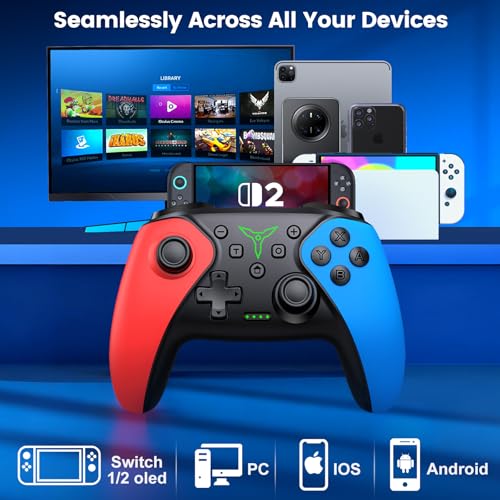 - 【SWITCH CONTROLLER & CONTROLLER STAND】This package comes with a Switch controller and a matching stand. Based before switch controllers we upgraded the wireless switch controller to compatible with Nintendo Switch 2 & Switch 1 Console/iOS/Android/PC(Wired), greatly increasing the types of games that can be played. Switch Pro Controller supports wireless connection to play switch games, iOS MFI games(IOS 13.0 and above), Android HID games; also can be via USB wired connection with PC to support playing X-Input and Steam games.(NOTE: DOES NOT SUPPORT WAKE-UP SWITCH 2 AND AUDIO FUNCTIONS) )
