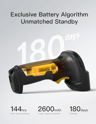 - Long-Lasting Battery Life: The Bluetooth wireless barcode scanner is equipped with a 2600mAh battery and integrates a low-power consumption algorithm. A single charge provides up to 180 days of standby or 180,000 scans, avoiding frequent recharging