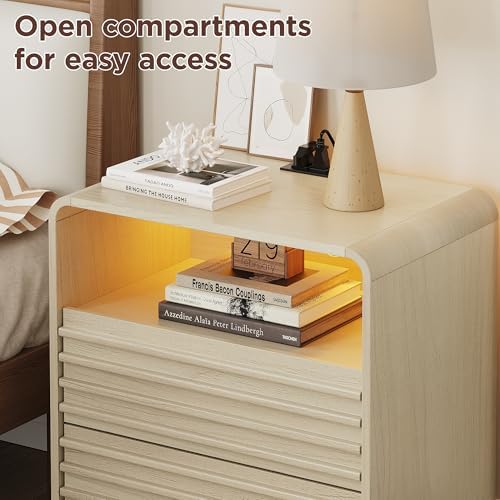 Fameill Fluted Nightstands,Nightstand with Charging Station,LED Night Stand with Two Drawers,Bedside Table with USB Ports and Outlets,Modern End Table for Bedroom (White)