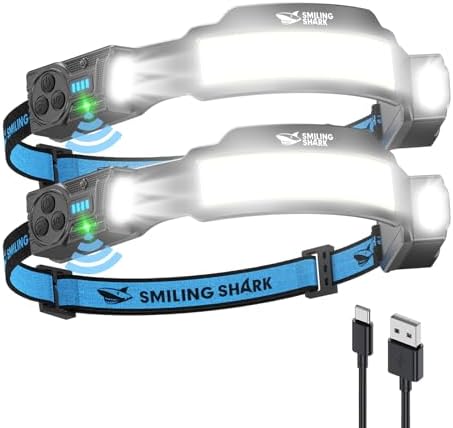 Smiling Shark TS-4 Headlamp, Dual Spotlight with 4X Floodlight & Strobe LED Head Torch Rechargeable 2400mAh Long-Lasting & Motion Sensor Hands-Free Design for Camping Hiking Running Jogging (2 Pack)