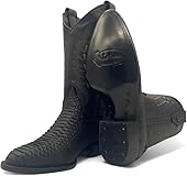 - Men’s genuine leather exotic embossed python snakeskin print boots made in Mexico with quality and comfort in mind. Features include a Round Toe profile, leather inner lining, leather soles for durability and leather stitched pull straps for easy pull on. Embroidered Shaft measures approximately 12 inches with a 1.5 inch heel.