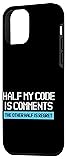 Perfect for software engineers, coders, and programming nerds who love sarcastic humor. Great for developers, computer geeks, and anyone with a passion for coding. Fun and witty design for work or casual wear. Half my code is comments. The other half is regret. Ideal for birthdays, holidays, or any special occasion for programmers, software engineers, and tech lovers. Great for friends, coworkers, or family who enjoy coding and clever computer sayings Two-part protective case made from a premium scratch-resistant polycarbonate shell and shock absorbent TPU liner protects against drops Printed in the USA Easy installation