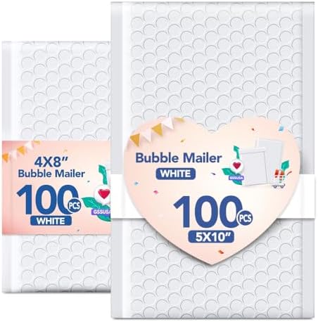 GSSUSA Bubble Mailers White 4x8Inch 100PC + White 5x10Inch 100PC, Usable Size 4X7"& 5x9" Bubble Envelopes for Small Business, Padded Envelope, Shipping Mailers, Packaging Bags, Mailing Envelopes