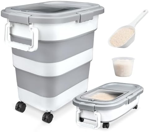 Rice Storage Container, Collapsible Airtight Food Storage Container 10-40 Lb, Rice Dispenser Bin with Cup and Scoop for Flour Cereal Pasta Grain, Cat Bird Pet Dog Food Storage Container 25lb