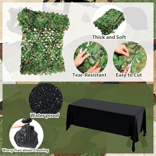 - Versatile Uses: camouflage netting and tablecloths are suitable for a variety of occasions, including military-themed party decorations, hunting, garden screens, privacy fences, birthday decorations, party awnings, camping, car covers, and shooting ranges; This set of tabletop decorations will add a touch of color to your decor and create a rich military atmosphere