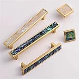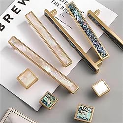- Elevate your cabinetry with these exquisite brass handles featuring stunning mother of pearl and natural shell inlays. Available in both square knobs and elongated bar pulls, these luxury hardware pieces showcase unique patterns and iridescent colors that make each one a miniature work of art. The collection offers multiple size options ranging from 30mm to 188mm in length, with consistent 24mm height across all variants. The brass construction provides durability while creating an elegant gold-toned frame that perfectly complements the natural shell materials. Choose from pearlescent white or vibrant blue-green abalone inlays, each displaying distinctive organic patterns. The handles come in various mounting hole spaces to fit standard cabinet configurations. The smaller square knobs weigh just 55g, while the largest bar pulls are 207g, ensuring sturdy functionality. These handles seamlessly blend sophisticated design with practical durability, making them ideal for kitchen cabinets, bathroom vanities, or custom furniture pieces requiring an artistic touch.