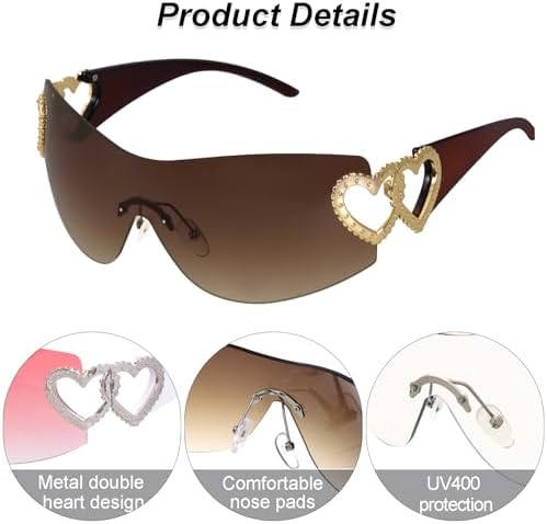 Revive the iconic aesthetics of the early 2000s with the JTYKUYR Wrap-Around Rimless Sunglasses. Combining retro charm and modern minimalism, these oversized shield sunglasses feature a frameless design with crisp clear lenses and metal heart decoration—a nod to the era’s obsession with metallic futurism. Perfect for trendsetters craving a blend of nostalgia and cutting-edge style, these shades are your ticket to standing out at Coachella, mastering streetwear layering, or channeling cyberpunk vibes on urban adventures.   Style Beyond Boundaries From travel dates to music festivals, these sunglasses can adapt to your lifestyle. High quality transparent lenses effectively block UV damage, protecting eye health while maintaining fashion, while the surround design provides panoramic coverage. Pair with chrome jewelry, shiny dresses, or worn-out jeans to create a "Y2K Rebirth" look  Optimized Dimensions: Total width 15 cm (5.9″), lens height 4.8 cm (1.88″), and adjustable 2.2 cm (0.86″) nose bridge for universal comfort.