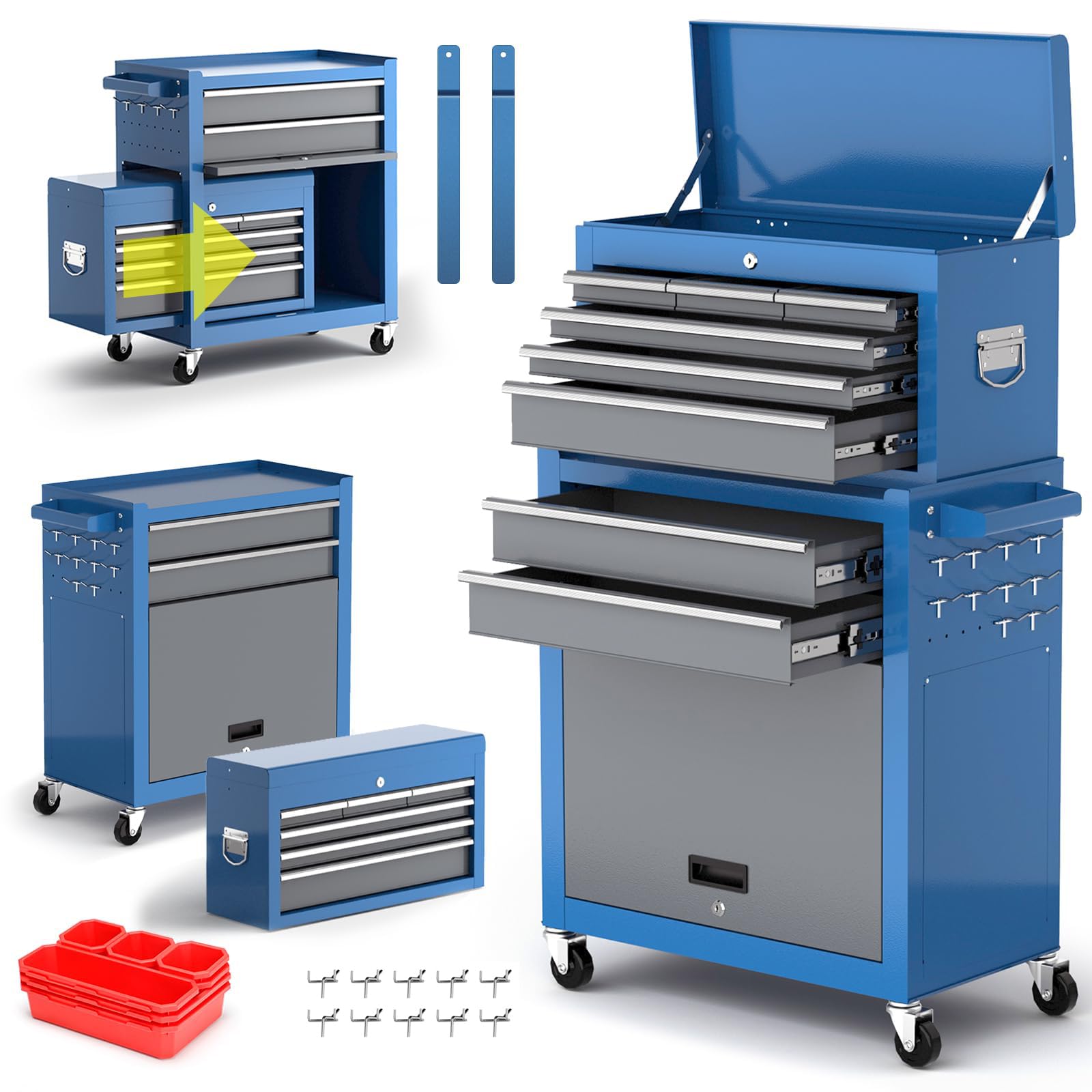 - Tool chest with drawers - Equipped with 1 large drawer, 3 medium drawers and 3 small parts drawers, you can store items by size and type, making it easier to store and access tools and keep them neatly organized.