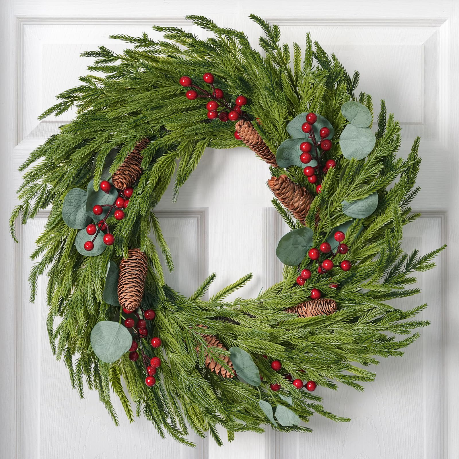 - 【Elevate The Atmosphere】:This Christmas wreath for front door is crafted from vibrant red berries, lifelike Norfolk pine needles, and European holly leaves—effortlessly capturing the warm essence of the holiday season and creating a rich festive atmosphere.