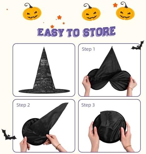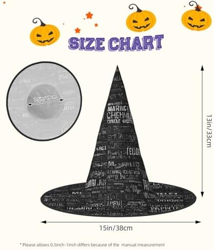 Product Name: Halloween Witch HatMaterial Type: Oxford FabricSize: Height: 33cm / 13 inches, Inner Diameter: 19cm / 7.5 inches, Outer Diameter: 38cm / 15 inchesAbout Our Halloween Hat:Product Features - Made from durable and soft Oxford fabric, our Halloween Witch Hat is designed for comfort and longevity. The unique foldable structure allows the top to collapse and the brim to twist and fold, saving space and making it easy to carry. The lightweight design ensures you can take it anywhere without feeling burdened.Applicable Scenarios - Perfect for Halloween parties, carnivals, masquerades, cosplay, and other themed eventsAccessory Structure - The hat's foldable design makes it easy to store and transport. Its size is suitable for most people, ensuring a comfortable fit. The lightweight structure means you can carry it around effortlessly, making it a convenient accessory for all your Halloween needs.Washing Instructions - Machine washable and hand washable, this hat dries quickly and is easy to care for. Please avoid using bleach to maintain the vibrant colors and fabric quality.Special Note - Due to different measurement methods, a slight size variation within 1-2cm is normal.
