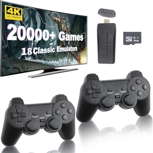 - Built-In 20,000+ Classic Retro Games & 18 Simulators: This wireless TV game console comes with a massive collection of over 20,000 classic games, 18 simulators, stored on a 64GB TF card. No downloads or internet connection are required—just plug it into your TV and enjoy instant access to a vast library of retro games. Relive your childhood memories and create new ones with family and friends!